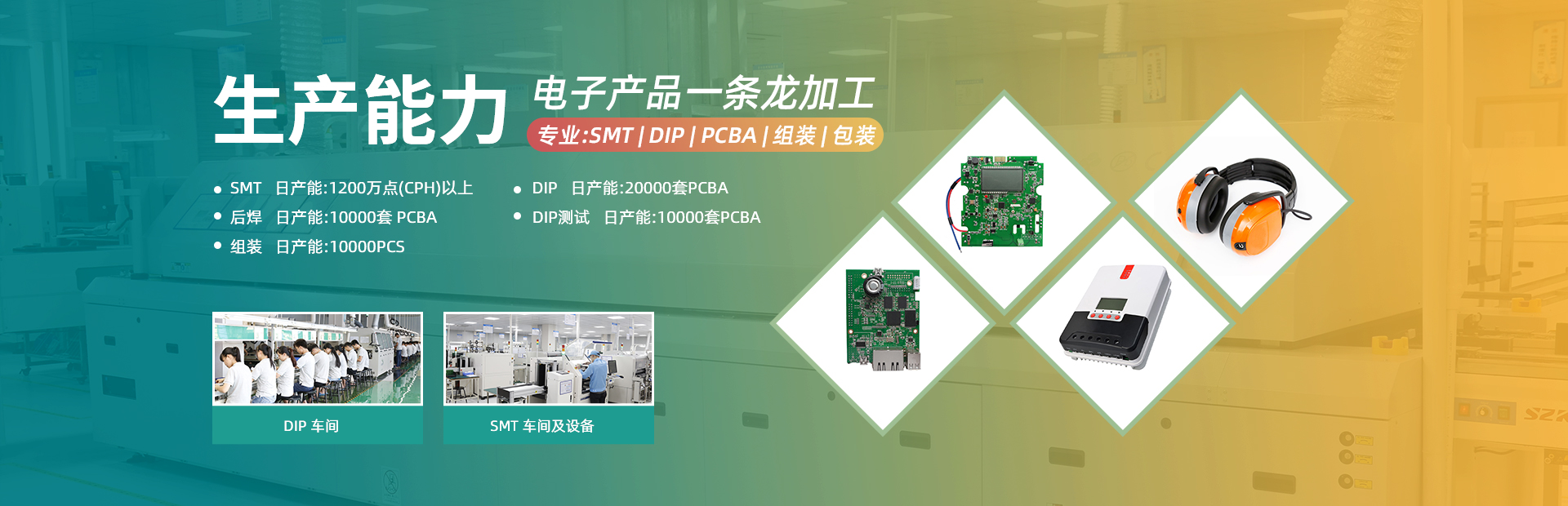 SMT贴片、组装加工一站式电子制造服务提供商,承接中、高端电子产品的贴片、插件、后焊、测试、老化、组装、包装等全配套服务